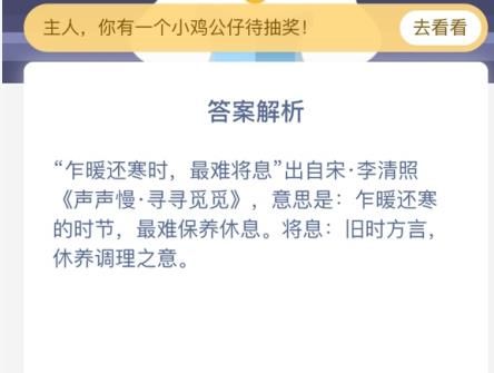 答案解析:“乍暖还寒时,最难将息”出自宋·李清照《声声慢寻寻觅觅》,意思是:乍暖还寒的时节,最难保养休息。将息:旧时方言,休养调理之意。