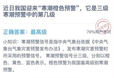 蚂蚁庄园寒潮橙色预警是三级寒潮预警中的第几等级?三级寒潮预警中如果发出了橙色预警哪么就代表这个地方即将迎来大面积大幅度的降温,这种级别都是最高级的预警,大家在看到自己所在的地区有这个预警的时候一定要做好保暖错失!