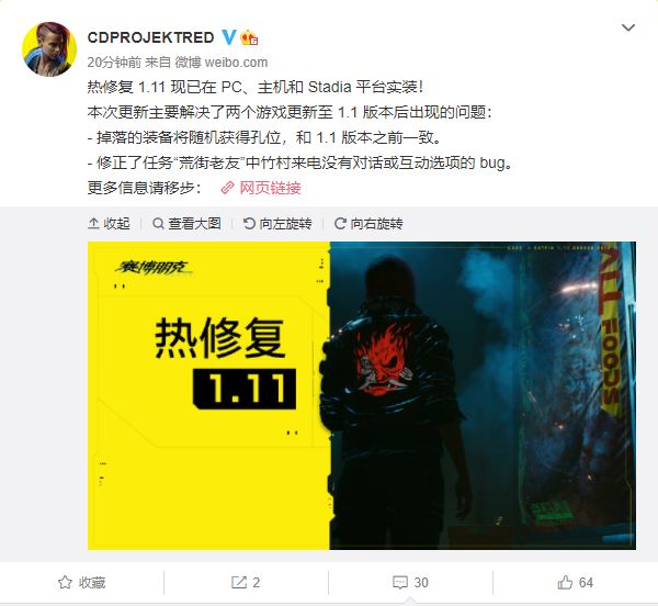 CDPR的官博刚刚公布了《赛博朋克2077》的热修复1.11,目前该修复已经实装到了PC、主机和Stadia平台。