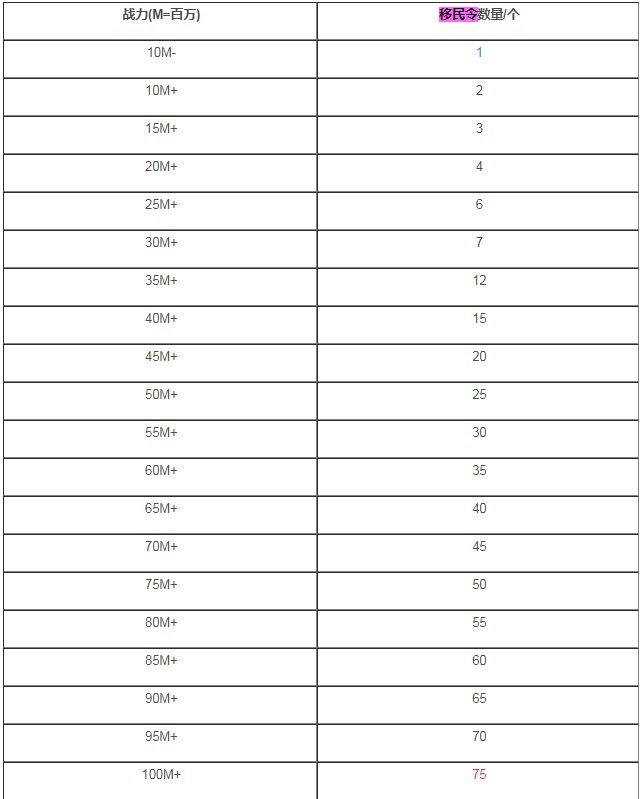 根据上表可知,移民最少要用1个移民令,最多要用75个移民令。如果你有移民的想法,建议还是尽早考虑好,不然到后面战力高起来后,移民的成本可太高了,对宝石也是一种极大的消耗。