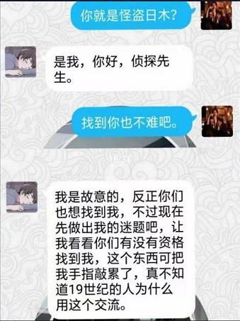 CRIMASTER的侦探通过反向追踪,取得了怪盗日木的联系方式,他把自己与怪盗的聊天公布了出来,希望侦探们共同追踪怪盗。