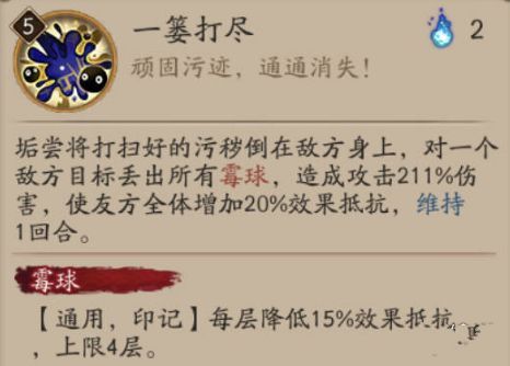 垢尝将打扫好的污秽倒在敌方身上,对一个敌方目标丢出所有霉球,造成攻击211%伤害,使友方全体增加20%效果抵抗,维持1回合