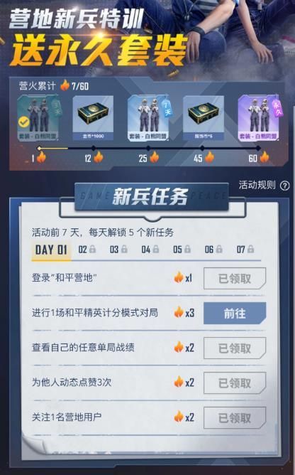 方法:下载本资源和平营地版本→资讯→推荐→新兵特训,每天完成五个任务应该六天就能领到。