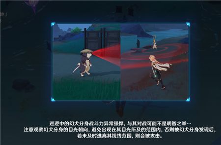 4、巡逻中的幻犬分身战斗力异常强悍,与其对战可能是不明智之举,注意观察幻犬分身的目光朝向,避免出现在其目光所及的范围内,否则被幻犬分身发现后,若未及时逃离视线范围,则会被攻击