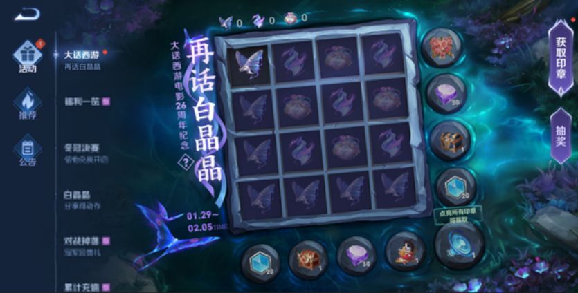 参与游戏内大话西游-再话白晶晶活动,完成指定任务可获得不同的印记。点亮活动页面每行、每列即可解锁对应奖励,全部点亮还可以免费得石班瑜老师录制的全新限时语音-晚安,我会想你;觉得意犹未尽?如果还想体验石班瑜老师魔性招牌笑声带来的快捷语音体验,大家还可前往商城进行获取。