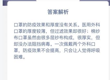 答案解析:罩的防疫效果和厚度没有关系。医用外科口罩的厚度较薄,但过滤效果却很好;棉纱布口罩虽然由很多层纱布构成,很厚实,但却没办法阻挡病毒。一次佩戴两个外科口罩,防疫效果不会提高,只会让人觉得唿吸困难。