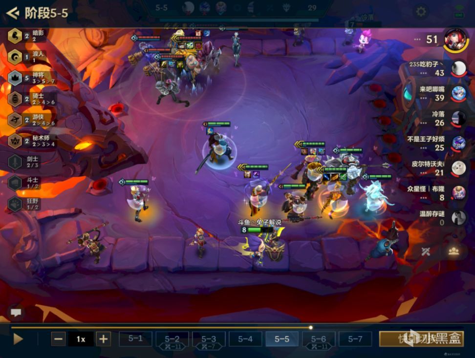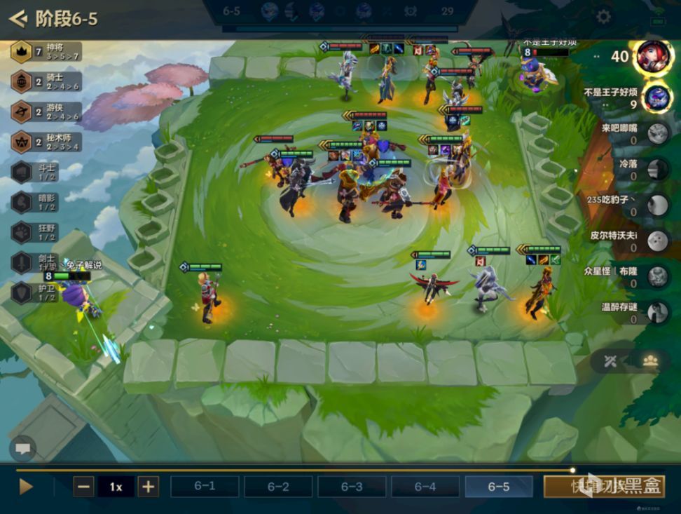 5-5选完秀回来就可以直接拉8人口梭哈了,必须找到天使开出7神将,没找到的话就5神将+骑士+游侠+护卫,猴子换成女坦,亚索换成布隆或者潘森,我这里是没找到天使就随便上了一张亚索。