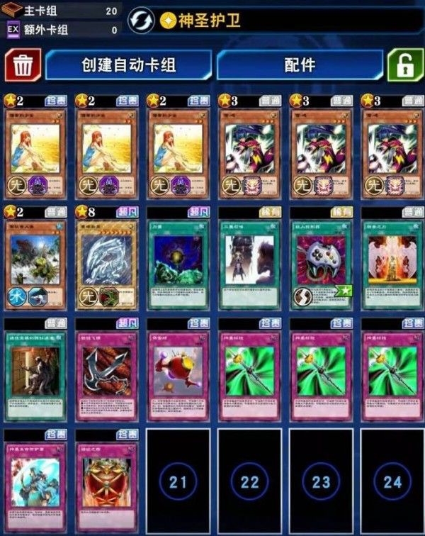 保命配件可以根据大家的牌库和喜好随意添加8张即可,图中为部分可选的牌池,无非就是扭防或者回血,以便在开局没抽到少女或者对方场攻可以斩杀的时候拿来救场。这里推荐大家用天梯R券换几张【神圣生命防护罩】,面对海马或者利息德这种可以把少女扭防的敌人也不虚。当然面对一些简单的敌人时,也可以换成加速过牌的单卡来提高刷分效率。或者在决斗得分差一两百分就多一个宝箱的时候,带一两张闪卡来增加一个宝箱