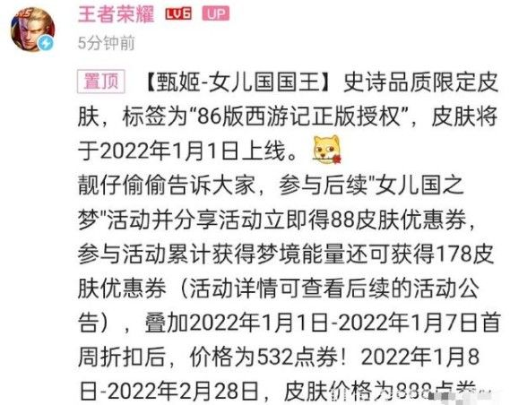 王者荣耀女儿国国王88皮肤优惠券获取方法