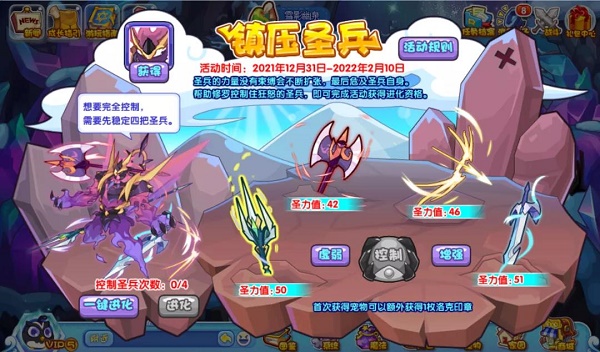 前期需要通过虚弱挑战守关的boss进行削减,每次战胜可削减8~13点圣力值;后期圣力值低于50则需要前往指定地点拾取圣兵器进行增强,道具每隔1分钟出现一次,提交一把可以获得2~7点圣力值。(每次增强扣除1个道具,背包内的所有宠物主属性与该圣兵主属性一样,道具增强的圣力值则改变为1点。如背包内宠物的主属性有不一样则无法改变)