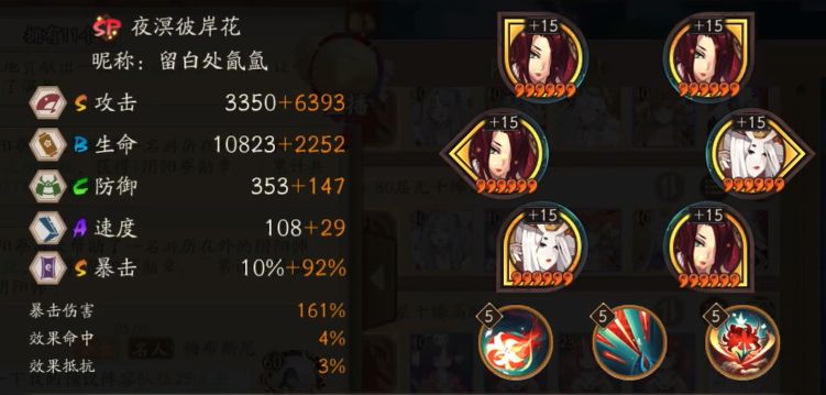 三速:SP彼岸花 针女歌姬堆攻击速度135-145之间,保证最后一轮是花出手