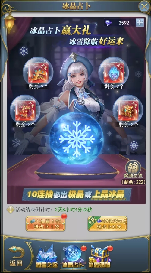 可通过单抽、十连抽(9折)进行占卜抽奖,霜雪之途活动中还会产出冰雪券,玩家可以消耗冰雪券直接抽奖。