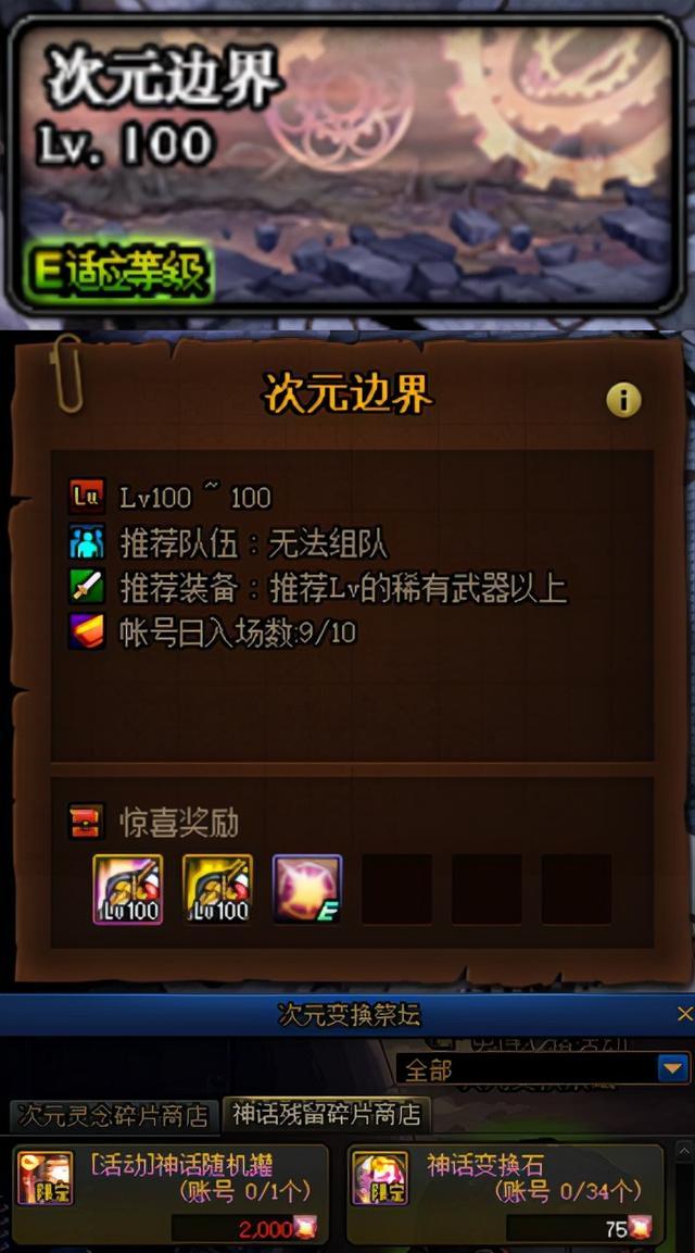 总的来说,“次元边界”是史诗之路的免费图,每天只有10次入场机会,不消耗疲劳和材料,掉落物品除装备外,只有“神话残留碎片”,可在神话碎片商店使用。