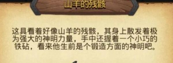这具看着好像山羊的残骸,其身上散发着极为强大的神明力量,手中还握着一个小巧的铁砧,看来他生前是个锻造方面的神明吧。