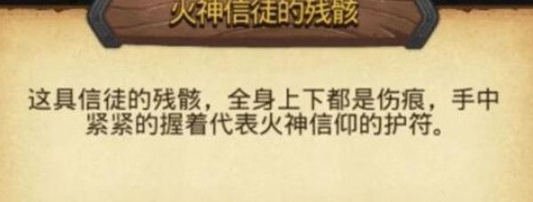 这具信徒的残骸,全身上下都是伤痕,手中紧紧的握着代表火神信仰的护符。