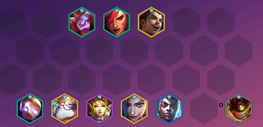 在后期,快速提升到8人口。然后用巨魔、蔚、杰斯、机=器人、风女、金克丝、艾克、炸弹人组成全部阵容。然后把输出装备搭配给金克丝和巨魔,防御装备搭配给杰斯。