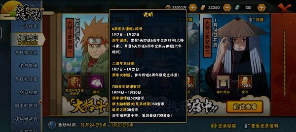 4、700金币感谢有你,1月14日—1月20日,周年回馈送520金币,秽土鼬相关兄弟终章150金币,追寻之路30金币。周年福利享不停,策划豪送700金币。
