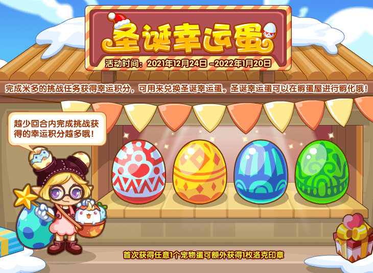 完成米多的挑战任务获得幸运积分,可用来兑换圣诞幸运蛋。圣诞幸运蛋可以在孵蛋屋进行孵化哦!