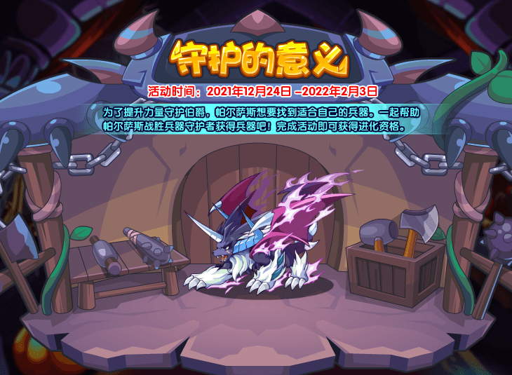 为了提升力量守护伯爵,帕尔萨斯想要找到适合自己的兵器。一起帮助帕尔萨斯战胜兵器守护者获得兵器吧!完成活动即可获得进化资格。(VIP1及以上用户可参与活动)