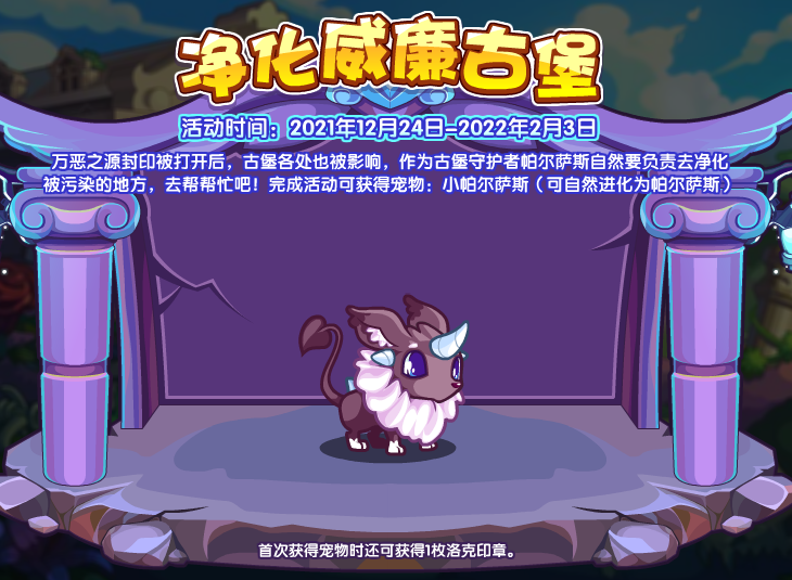 万恶之源封印被打开后,古堡各处也被影响,作为古堡守护者帕尔萨斯自然要负责去净化被污染的地方,去帮帮忙吧!完成活动可获得宠物:小帕尔萨斯(可自然进化为帕尔萨斯)