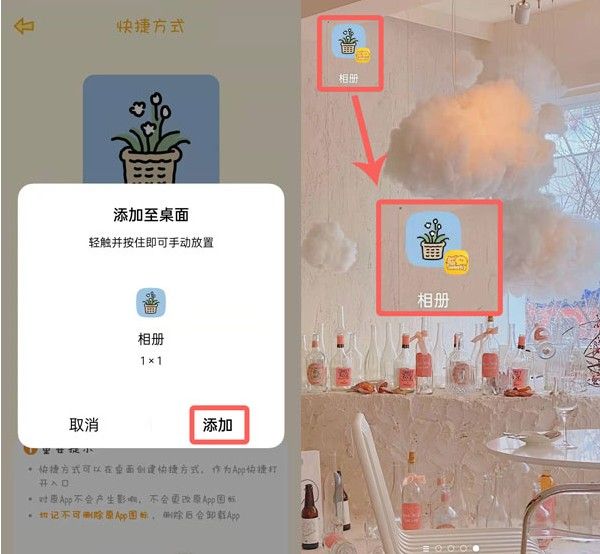 8、最后点击【添加】将其添加到你的桌面上即可,由于使用设备不同,图标显示的效果也不同,如oppo手机换图标后会显示上图样式。