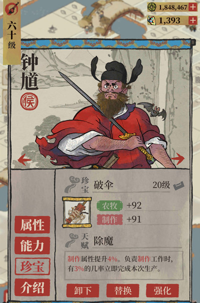 其实,破伞是钟馗这个角色的专属珍宝,效果是农牧+92、制作+91,同时还有一个天赋除魔,可以让制作属性提升4%。