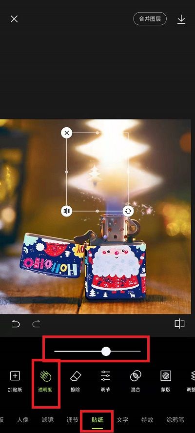 5、然后再放置一个火焰圣诞树,然后点击【透明度】把第二个圣诞树放大,再把放大的圣诞树透明度调整到60即可;
