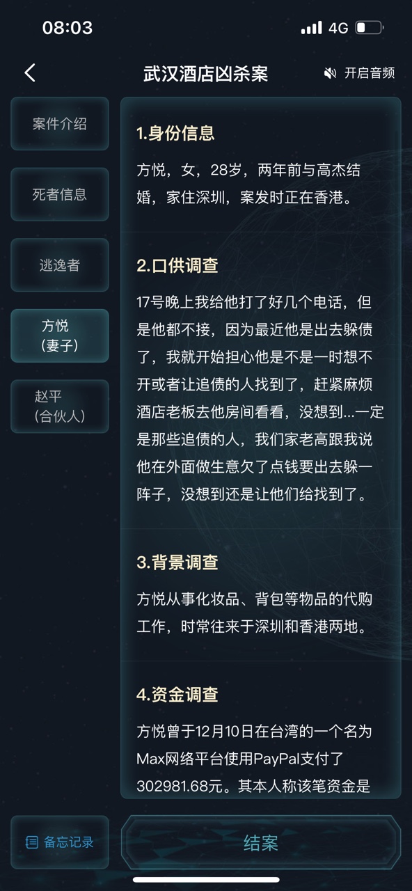 回过头来看这条,12.10,方悦有三十万去买比特币,而高杰却时时刻刻都在躲债,方悦这三十万虽然不能帮高杰还清债务,却肯定可以缓解他的压力,但方悦没有将这三十万给高杰,所以我认为他们两个的感情是出了问题的,并且方悦买比特币是用来雇凶杀人的。