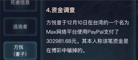 方悦曾于12月10日在台湾的一个名为Max网络平台使用PayPal支付了302981.68元。其本人称该笔资金是在博彩中输掉的。