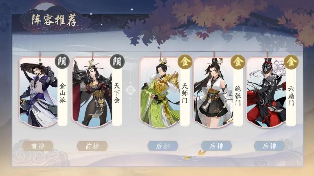阵容解析:绝张门和六扇门能组成强大的双神射C位体系,六扇门有不错的群体输出,绝张门有高额的单体输出,再加上金山派和天下会的前排吸引火力,金山派的压低血线,可以瞬间对敌方C位形成有效的刺杀,融化敌方后排,牵制敌方前排,天师门还能加快核心C位的启动效率。