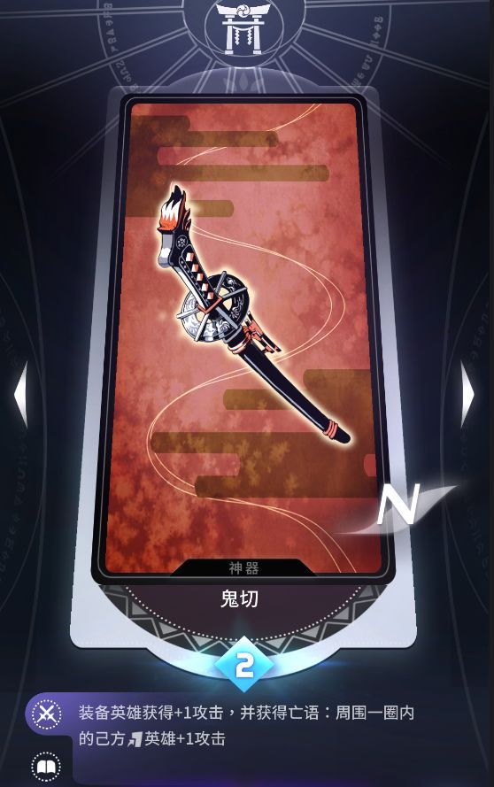 阴阳道在前中期有2张神器牌是必须要带的,他能极大的加强阴阳道对敌方君主的贴脸伤害,分别是“鬼切”和“天狗鸦羽”,鬼切可以提高场面上英雄的攻击力,而天狗鸦羽则让一个英雄附带连击效果。