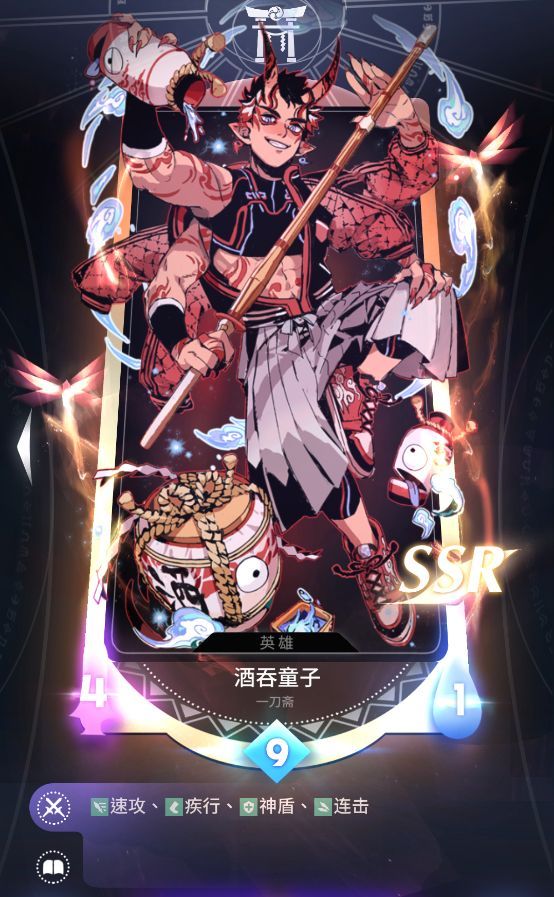 最后不得不提的就是阴阳道的BOSS“酒吞童子”了,这张虽然攻血属性不高,但是可真是一位一击必杀的BOSS,他的上场,基本可以说是对手生命的终结,配上灵枪这张神器牌可以到达7攻,它所带的速攻技能,可以让酒吞童子不受下牌回合限制,下牌即可行动攻击,急行技能可以让酒吞一次行走2格距离,神盾技能可以使它免疫一次伤害,连击可以让它在一个回合攻击2次,这些组和在一起,那么就是酒吞可以在单回合造成14点伤害,试问酒吞一出,谁能不死?