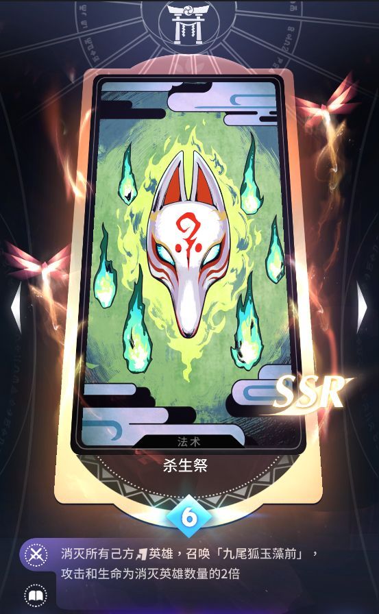 法术上,阴阳道可以说有两张极为阴霸的法术牌,分别是“通灵缚”和“杀生祭”,通灵缚的自爆能力可以说是几乎清场,而杀生祭则可以献祭掉场上所有的牌,获得一张生命、攻击等于消灭英雄数量乘以2的衍生物,如果你觉得场面上的牌虽然很多,但是不足以和对方的后期牌抗衡了~还是早早的献祭掉,把大哥召唤出来吧。