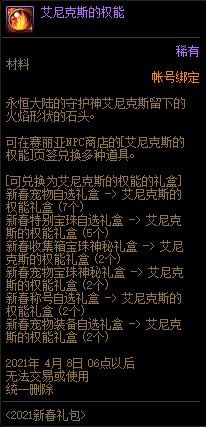 2021春节套礼包中的新春宠物自选礼盒、新春特别宝珠自选礼盒、新春收集箱宝珠神秘礼盒、新春宠物宝珠神秘礼盒、新春称号自选礼盒、新春宠物装备自选礼盒等道具均可兑换为艾尼克斯的权能。