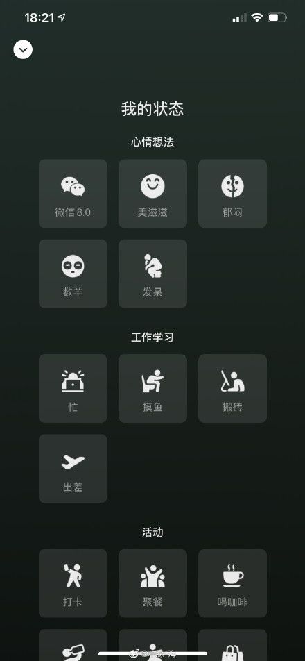 微信 8.0的个人主页多了一个“我的状态,用户可以在这里设置自己的状态和心情,状态和心情会显示在相应的地方,并且还有相应的图标展示,还是相当有趣的!