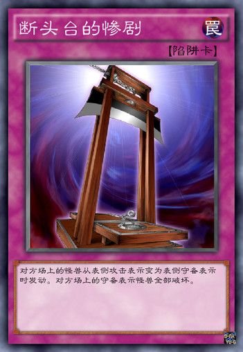 断头台的惨剧:通过卡片商人获得,配合暴风、阿努比斯的诅咒和噩梦之迷宫能够炸掉对方全部守备怪兽;