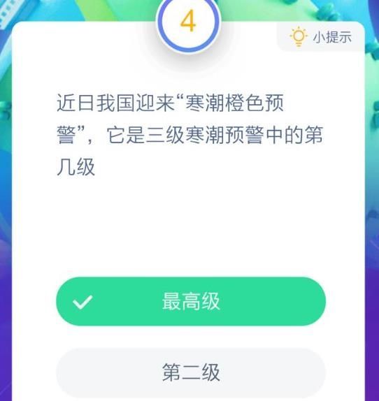 蚂蚁庄园寒潮橙色预警是最高级别吗?寒潮橙色预警是几级?1月3日的最新问题中,大家会遇到寒潮橙色预警是三级寒潮预警中的第几级,那么就要赶紧了解寒潮橙色预警的等级和含义,具体的可以看本站小编分享的攻略。