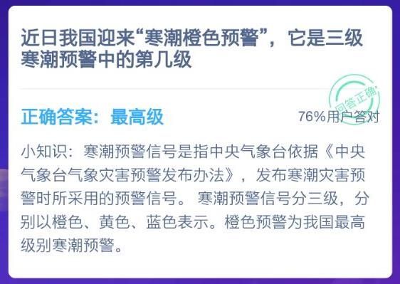 近日来我国迎来寒潮橙色预警,它是三级寒潮预警中的第几级?蚂蚁庄园1月3日今日答案