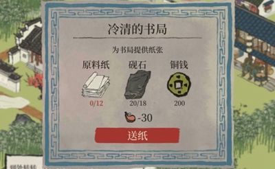1、任务冷清的书局中,需要玩家提供原料纸*12,砚石*18,铜钱*200,体力30;