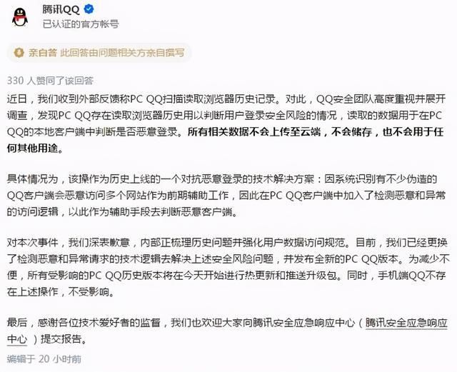 1月18日,腾讯QQ在其知乎官方号上回答该提问时表示,近日,我们收到外部反馈称PC QQ扫描读取浏览器历史记录。对此,QQ安全团队高度重视并展开调查,发现PC QQ存在读取浏览器历史用以判断用户登录安全风险的情况,读取的数据用于在PC QQ的本地客户端中判断是否恶意登录。所有相关数据不会上传至云端,不会储存,也不会用于任何其他用途。