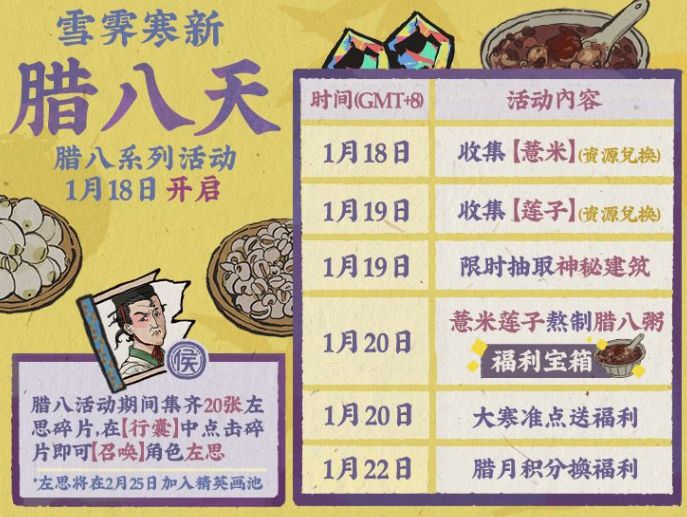 1月18日11:00起,参与“雪霁寒新腊八天”活动即可获得金画轴、补天石、侯级新居民【左思】等福利!