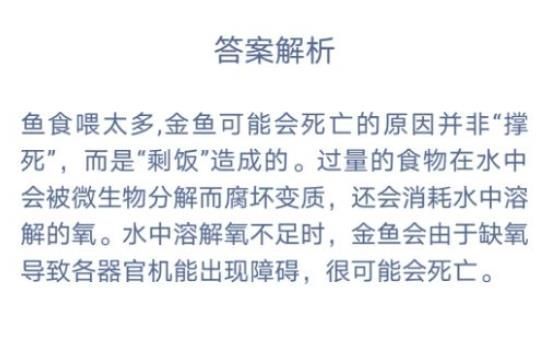 答案解析:鱼食喂太多,金鱼可能会死亡的原因并非“撑死”",而是“剩饭"造成的。过量的食物在水中会被微生物分解而腐坏变质,还会消耗水中溶解的氧。水中溶解氧不足时,金鱼会由于缺氧导致各器官机能出现障碍,很可能会死亡。