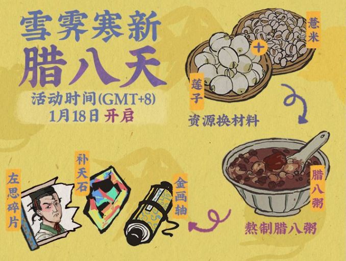 玩家们需要通过收集食材薏米以及链子,通过收集这两个食材才能兑换腊八粥,通过腊八粥就可以获得相对应的有效奖励,比如补天石、金画轴、做事碎片,活动从1月18日开始,玩家们记得到时候参与活动就可以了。