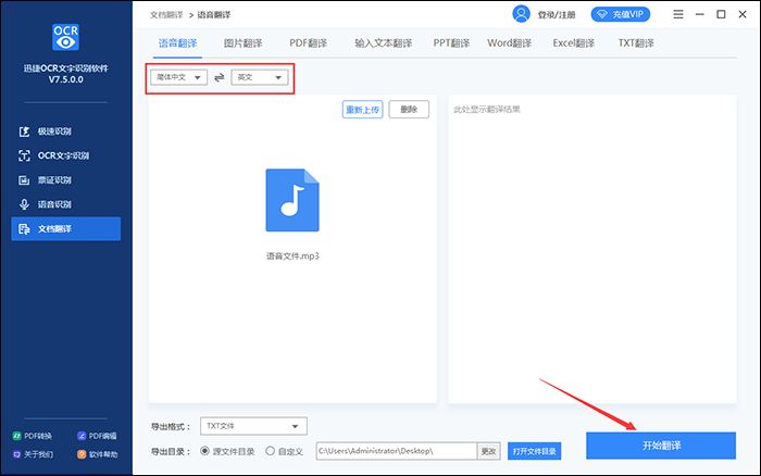 3、然后在页面中设置语音翻译形式为“简体中文→英文”,然后点击“开始翻译”就可以了。