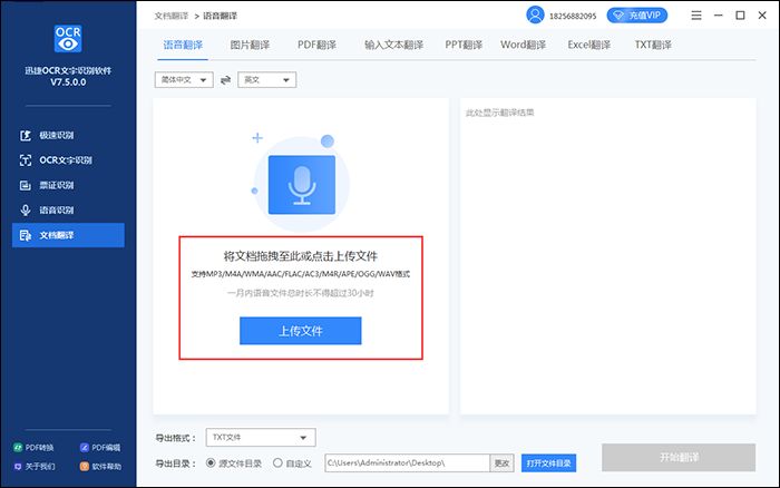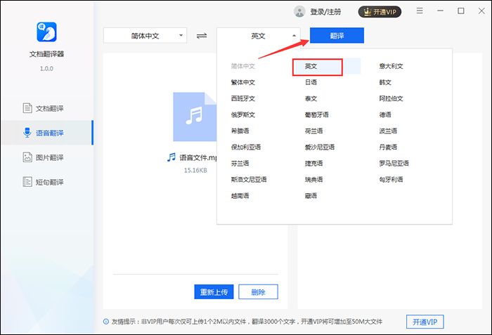 1、点击文档翻译器首页中的“语音翻译”,然后点击“点击上传音频”将语音文件添加进去就可以了。