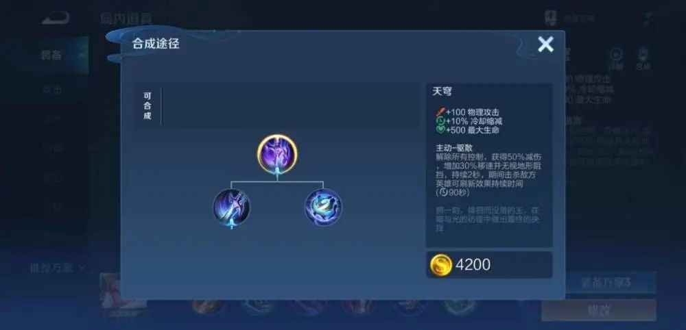 合成后效果:提升英雄100物攻,10%冷却时间和500点生命,同时获得主动驱散效果。