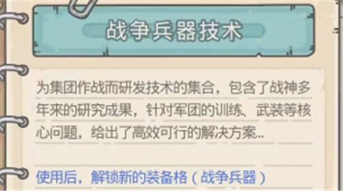 战争兵器技术获得方法:完成书架中的【交易的艺术】后,在米国神域中会开启道具商店,就能购买这个技术后。然后去背包的特殊道具中,使用技术就能开启战争兵器功能,即解锁第三行的装备栏。