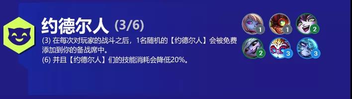 阵容玩法特别简单,只用凑齐3约德尔人就可以每回合白嫖任意的约德尔人单位,全员无脑追3,而且系统不会再给你发已3星的约德尔人单位,只要能独家黄金军团手到擒来!