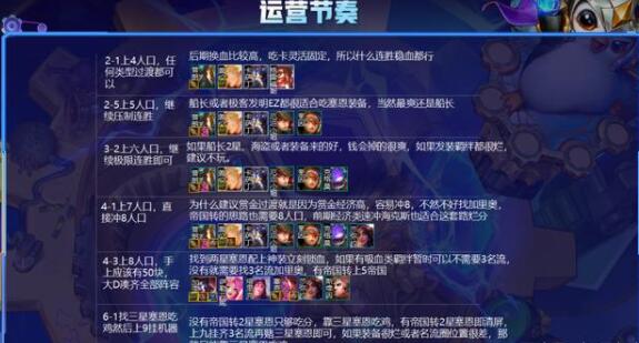 3-2上六人口,没有男枪也可以莎弥拉或者凑3帝国男刀吃装备过渡,莎弥拉后期好找,卖掉换也是可以的,不要不舍得给,特别是前期有帝国海克斯的时候,2张卡就凑3帝国,伤害提升60%性价比极高,不过更爽的还是船长,可惜忘了录像了,不然船长神装一枪一个配合杀戮律动无限回血满场是钱是真的爽。
