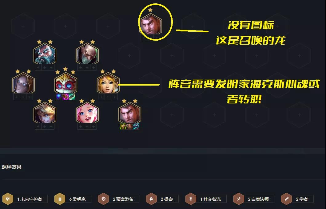 7发明的龙无比强势输出与坦度极高,如果有海克斯强化自我修复直接无敌,死了还能复生,如果没有发明家羁绊转职、心、魂基克5发明+4学者或5发明3白2发条,如果输出装备多也可考虑上烬当输出主C,强度依然爆炸。